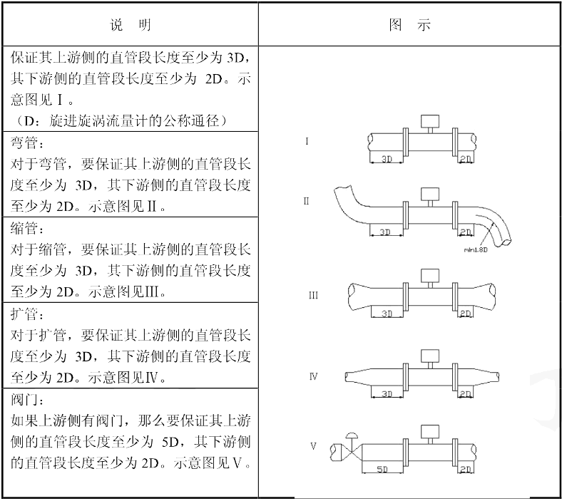 根據(jù)旋進旋渦流量計的工作原理和流量計對上、下游直管段要求,對不同的上游阻力件,建議采用正確的前后直管段長度,且保持直管段內(nèi)壁光滑平直。那下邊小編就用表格的方式為大家介紹前后直管段長度的安裝要求?!?